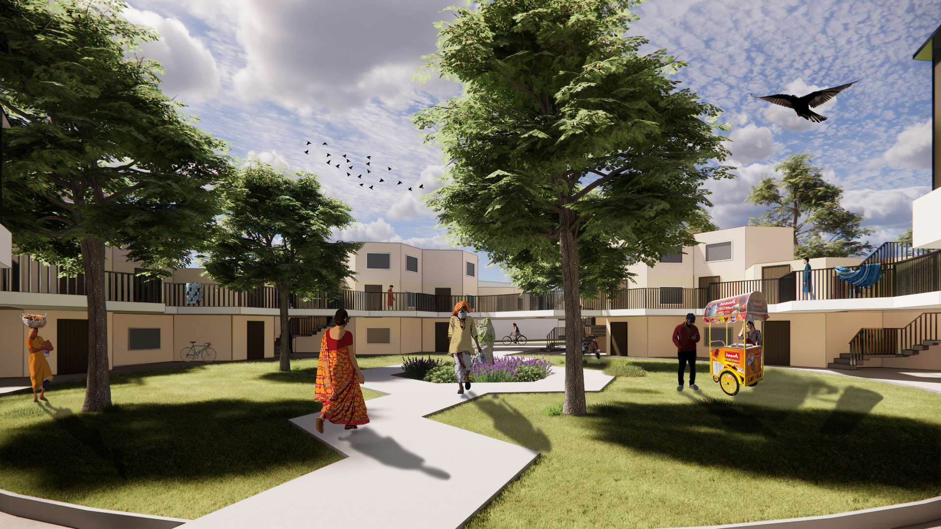 The India Housing Project was unique in its approach to the area's environmental concerns. It used Micelium bricks as insulation to help absorb the abundant carbon dioxide in the air and utilized an off-site construction tactic that allowed for the local environment to be brought up to health code while the locals were across the river until the homes were finished.