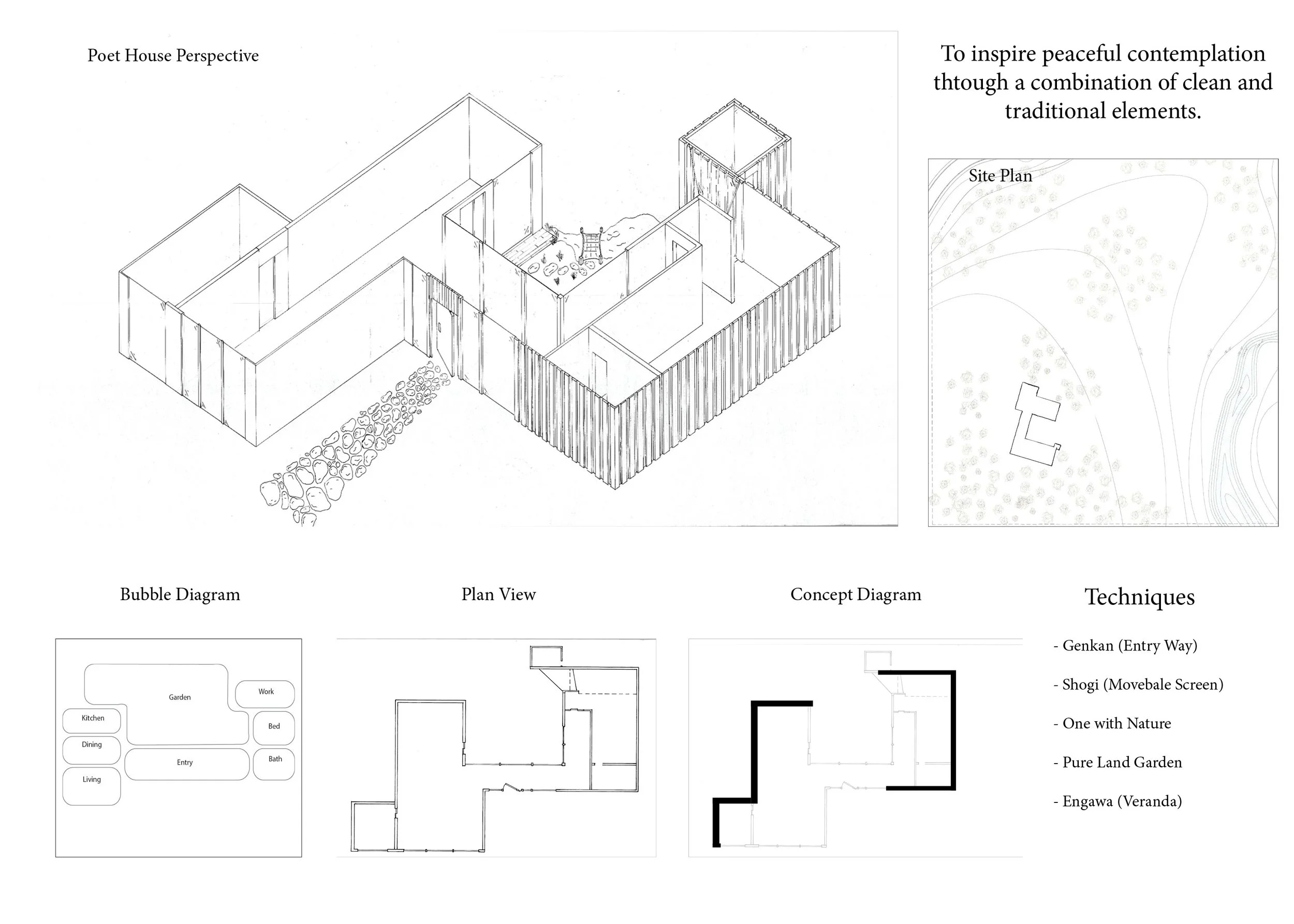 This house was the combination of my passion for Japanese culture and my love for designing homes. I was able to take my background in storytelling and combine it with my knowledge of Japanese tradition. In doing so, I created a house modeled after the traditional Japanese 3-segment home with a twist. This gave the client space to write while staying in touch with the rest of the home.